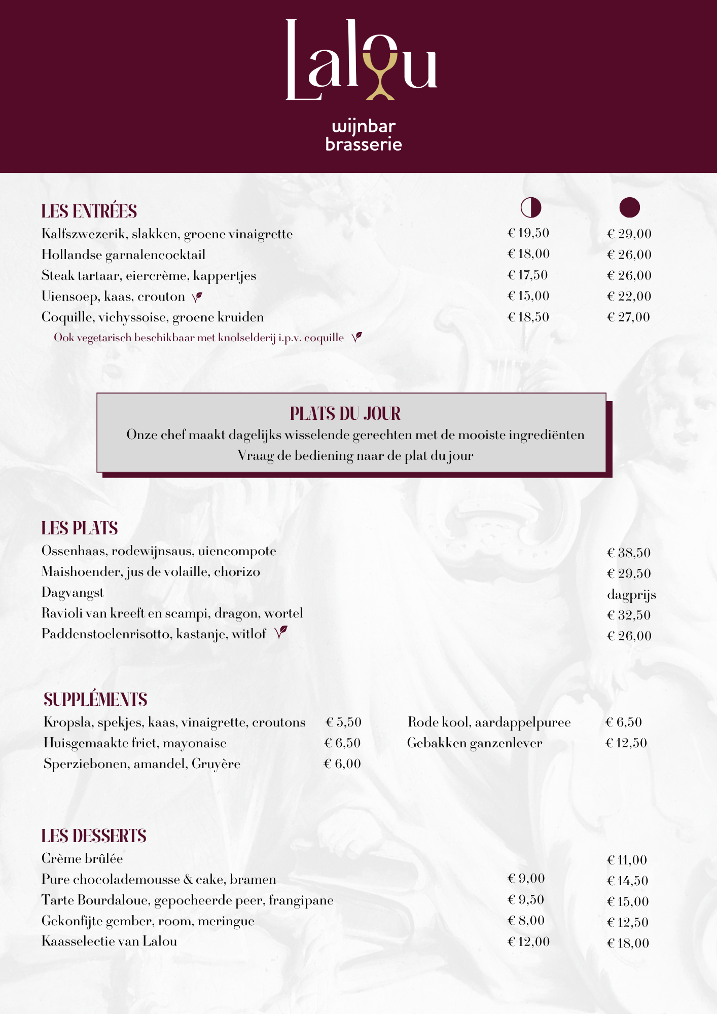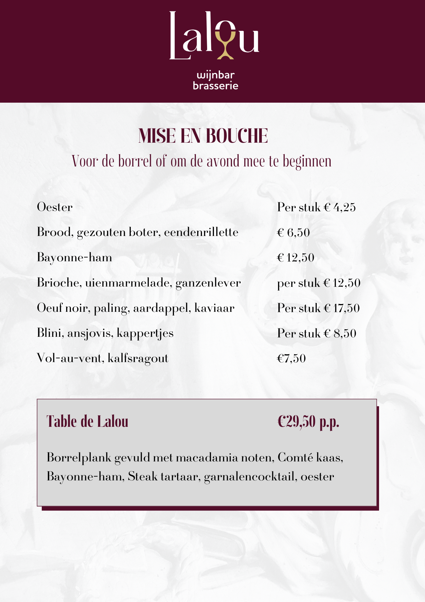 Of je nu kiest voor een uitgebreid diner in onze elegante brasserie of een informeel hapje in de gezellige wijnbar, bij Lalou geniet je overal van onze culinaire creaties. Onze twee menukaarten – één voor de brasserie en één voor de wijnbar – bieden een gevarieerde selectie van gerechten die perfect passen bij jouw moment. Van smaakvolle borrelhappen tot verfijnde seizoensgerechten, er is altijd iets wat jouw culinaire hart sneller laat kloppen.